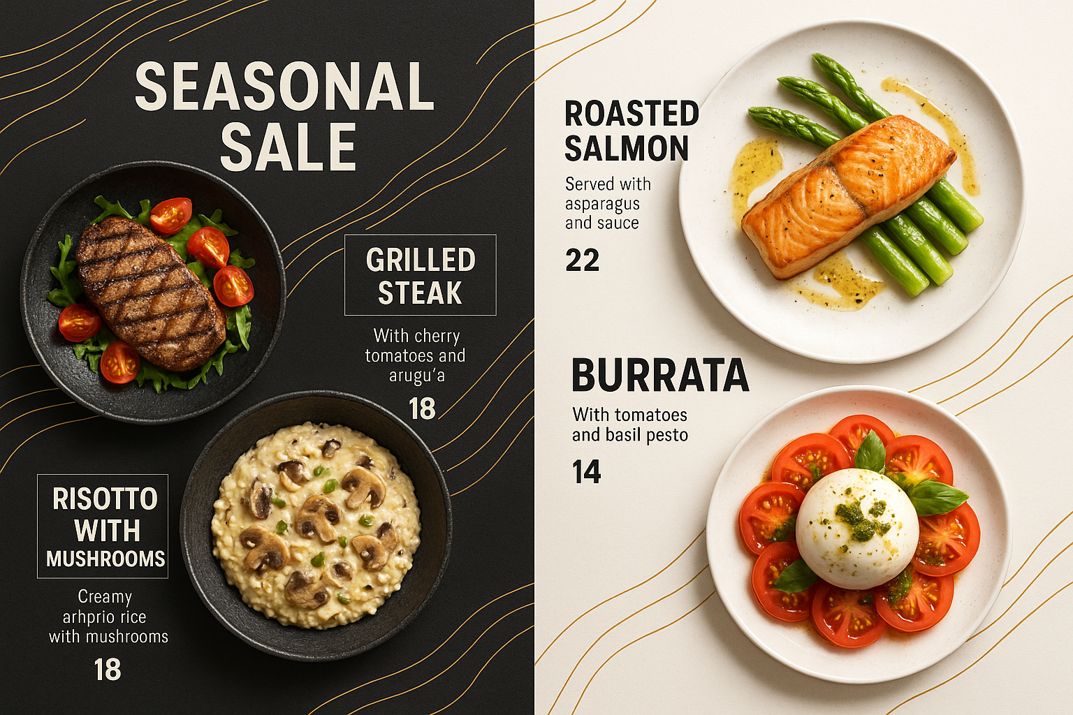 /Collection: /by davooda/Type: PNG/A seasonal sale poster for a gastro-bar menu, showcasing dishes with elegant typography against a contrasting background. Features realistic food photography and clear pricing.