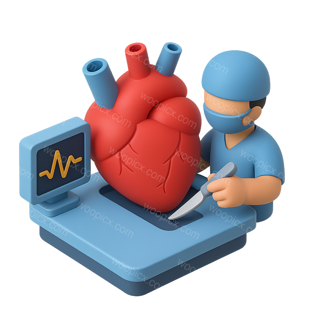 A stylized 3D representation of heart surgery, featuring a surgeon, a heart model, and medical equipment. The image showcases a vibrant and engaging design with a transparent background.
