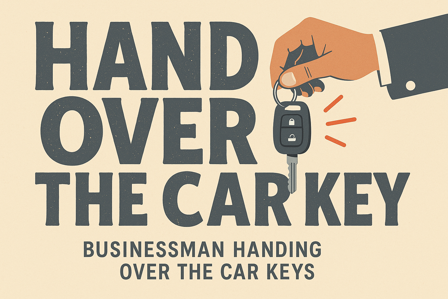 Illustrative graphic depicting a businessman handing over car keys, designed with bold typography and a minimalist style, ideal for automotive or business-related contexts.