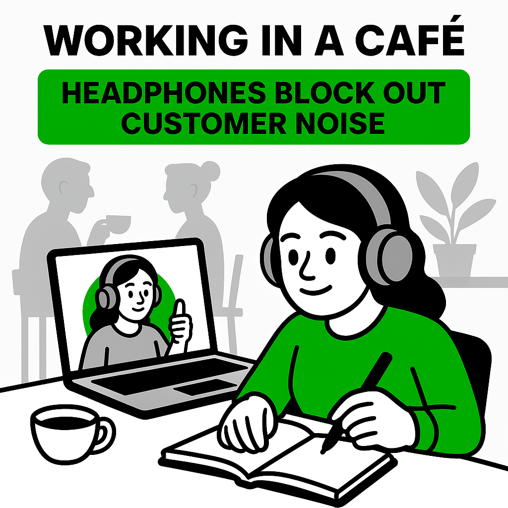 /Collection: /by davooda/Type: PNG/A vibrant illustration depicting a person working in a café, using headphones to block out noise. This graphic conveys the theme of remote work and productivity in public spaces, ideal for articles or promotions related to work-life balance.