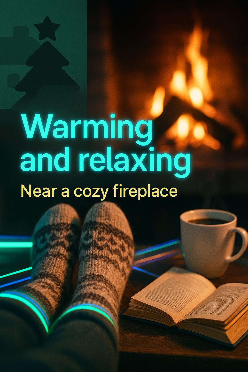 Warm and inviting image featuring a person’s feet in cozy socks near a fireplace. Ideal for promoting relaxation and comfort-themed content.