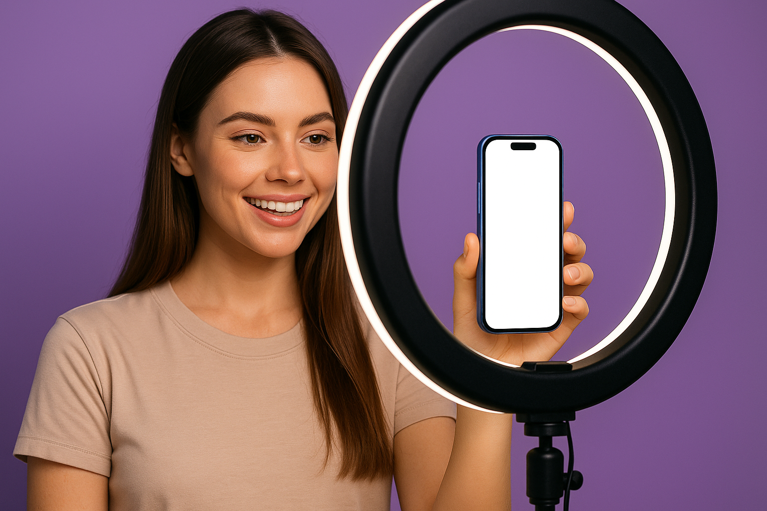 A young female blogger smiles while holding a blue smartphone in front of a ring light. The background is a soft purple, enhancing the vibrant setup.