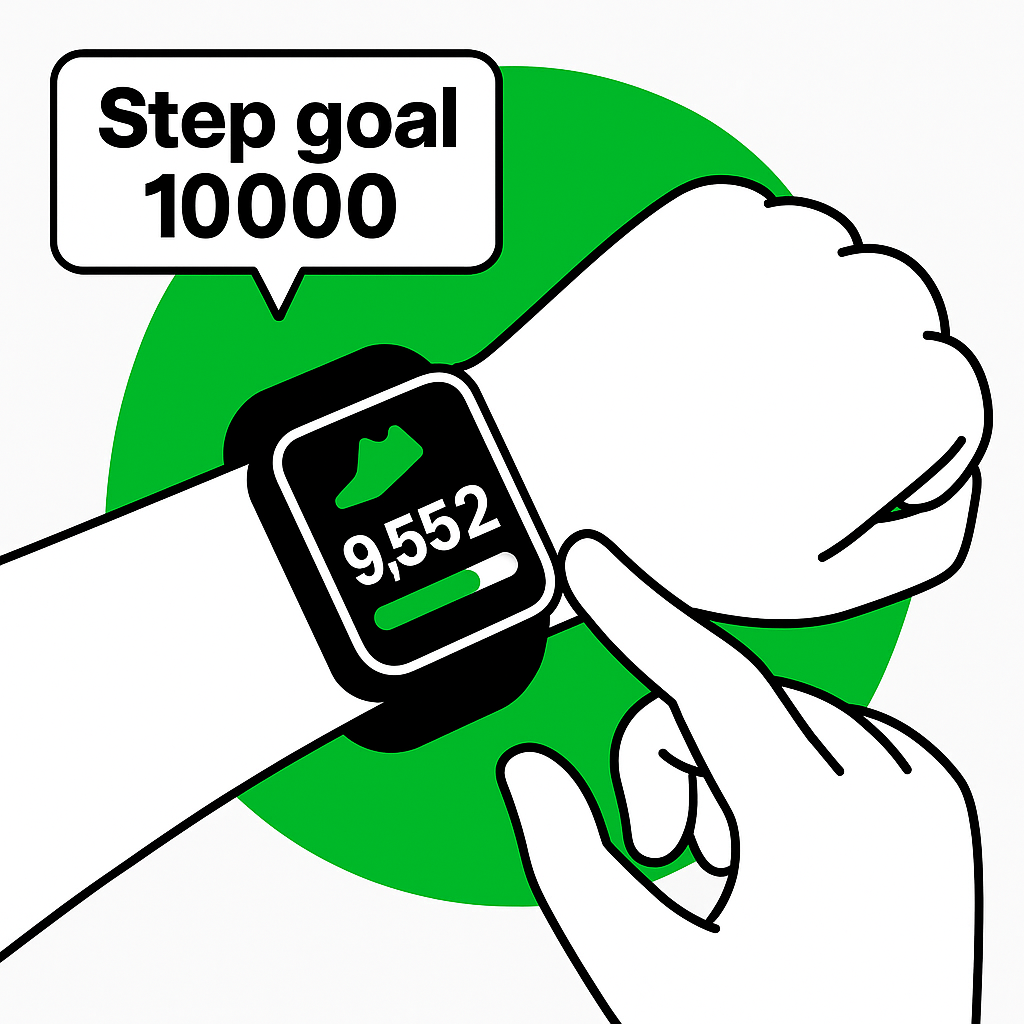 /Collection: /by davooda/Type: PNG/Stylized illustration of a fitness tracker displaying step count and goal. The graphic features a hand interacting with the device, ideal for health and wellness content.