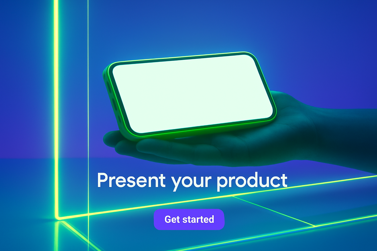 /Collection: /by davooda/Type: PNG/A green phone held horizontally in a hand, showcased against a solid blue background. Neon lines illuminate the scene, highlighting the phone and creating a modern atmosphere.
