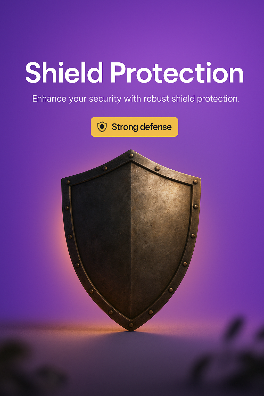 This image is a promotional banner featuring a metallic shield on a purple background. It emphasizes security and protection, targeting audiences interested in safety solutions.