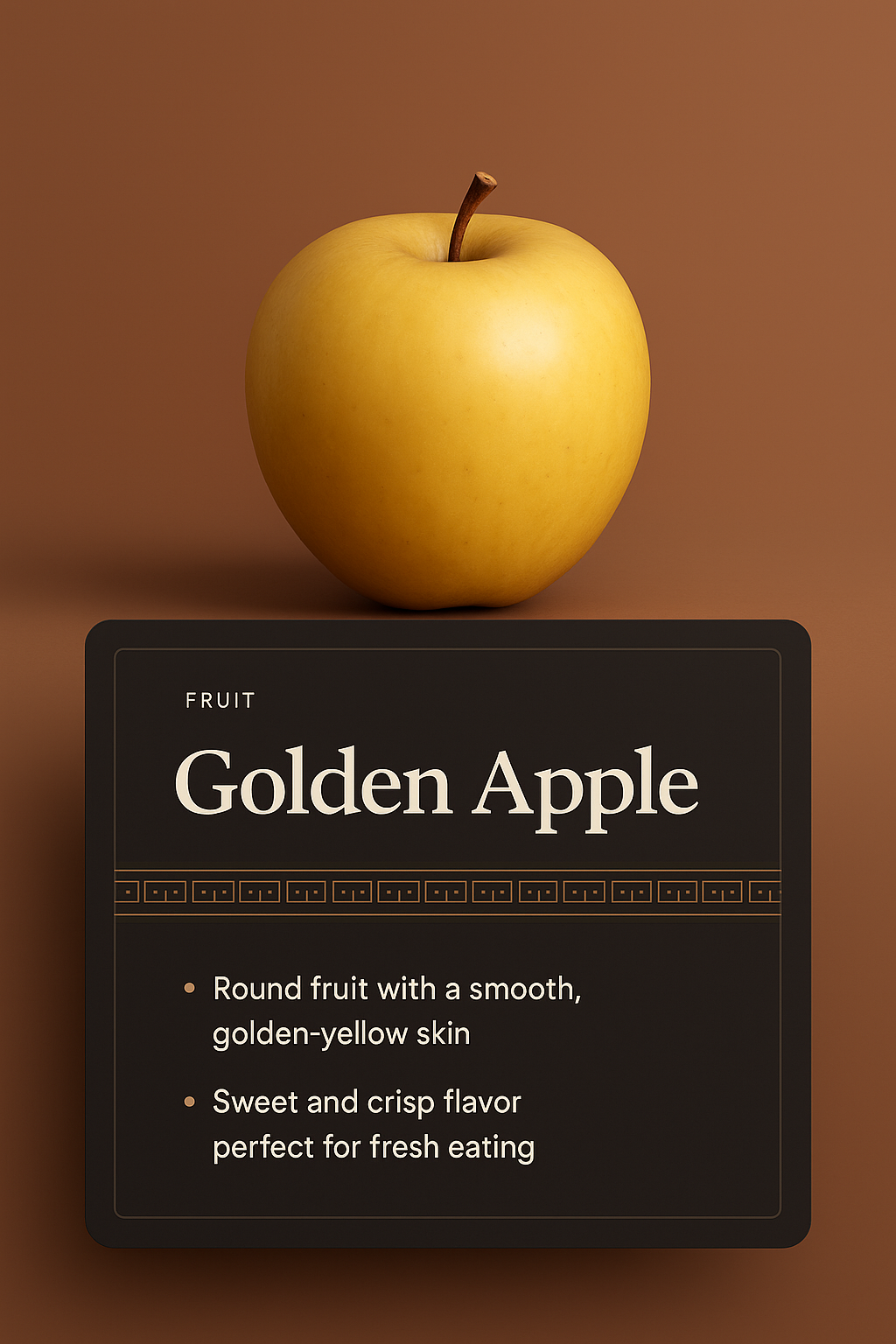 A 3D golden apple on a brown background, accompanied by a dark information block detailing its features and flavor. The design is cohesive and visually appealing.