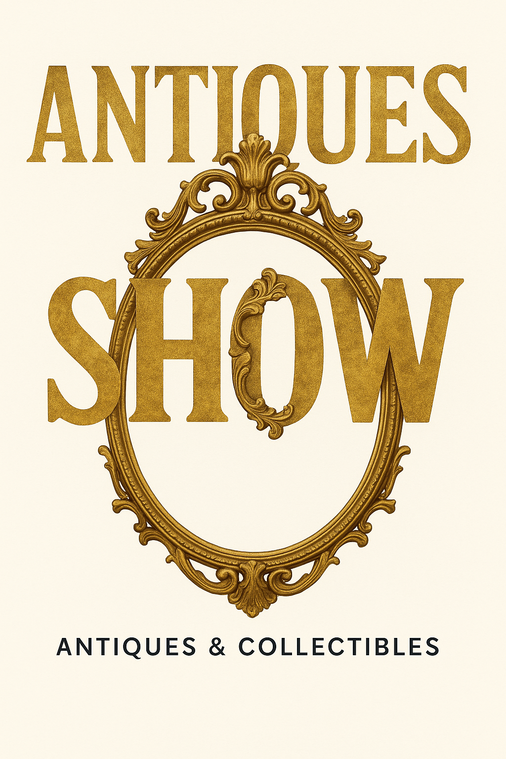 Stylish promotional graphic for an antiques show featuring ornate typography and a vintage design aesthetic, ideal for event marketing.