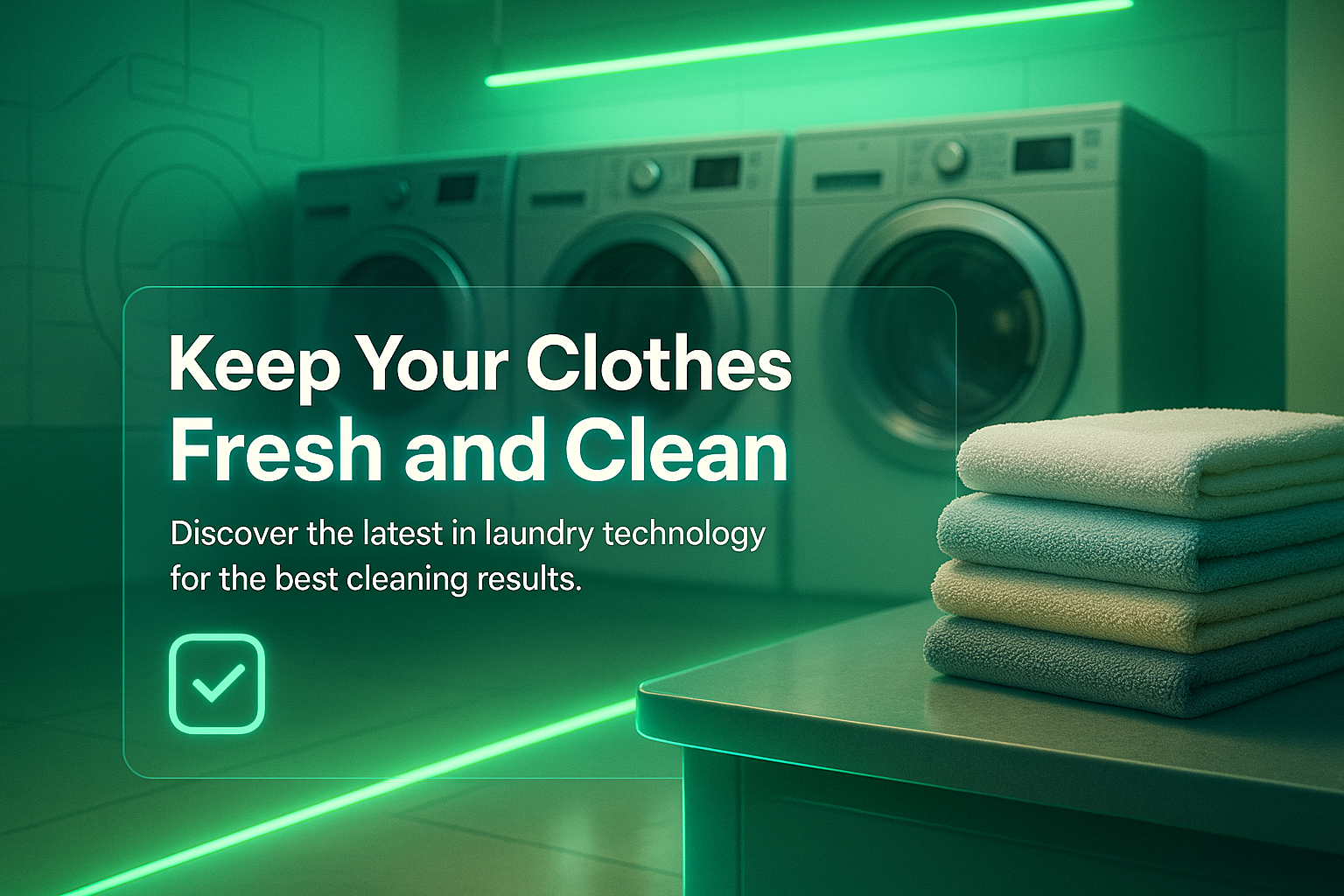 /Collection: /by davooda/Type: PNG/Promotional graphic showcasing a modern laundry room with clean towels and washing machines, designed to highlight advanced laundry technology and promote freshness.