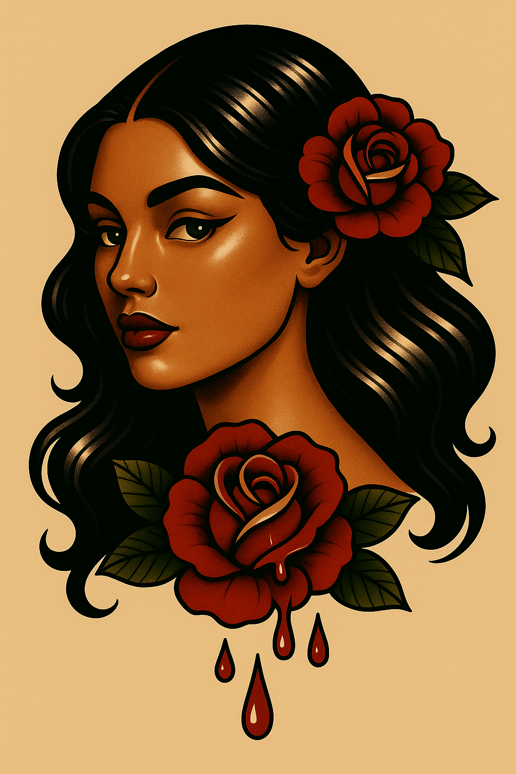 Stylized Tattoo Art of a Woman with Blood-Dripping Roses