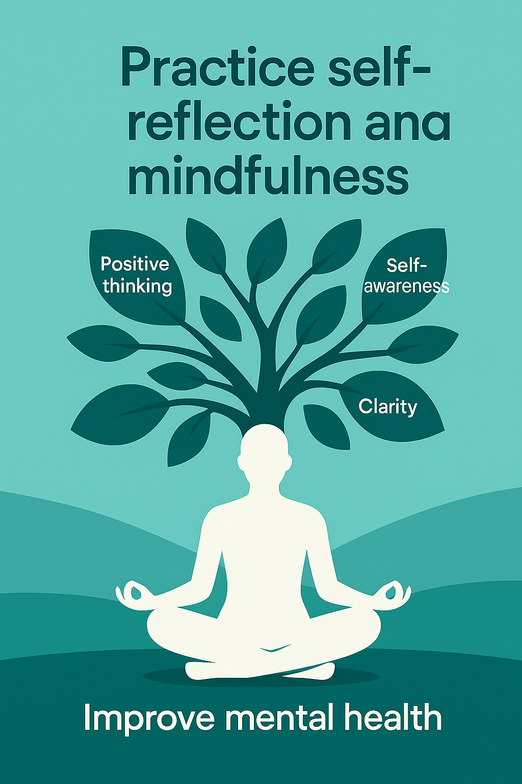 Illustrative graphic promoting mindfulness and self-reflection with a calming color palette and tree motif, ideal for mental health awareness campaigns.