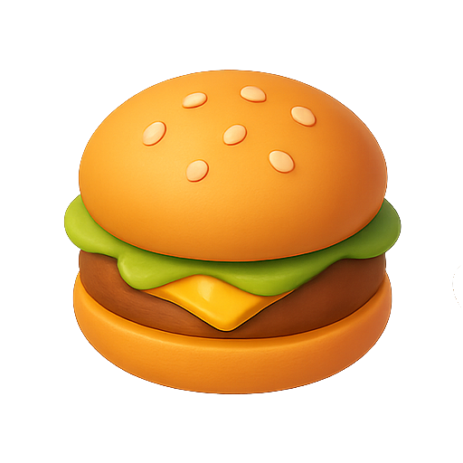 A vibrant and realistic hamburger emoji featuring a sesame seed bun, lettuce, cheese, and a beef patty. Ideal for use in digital communication and food-related content.