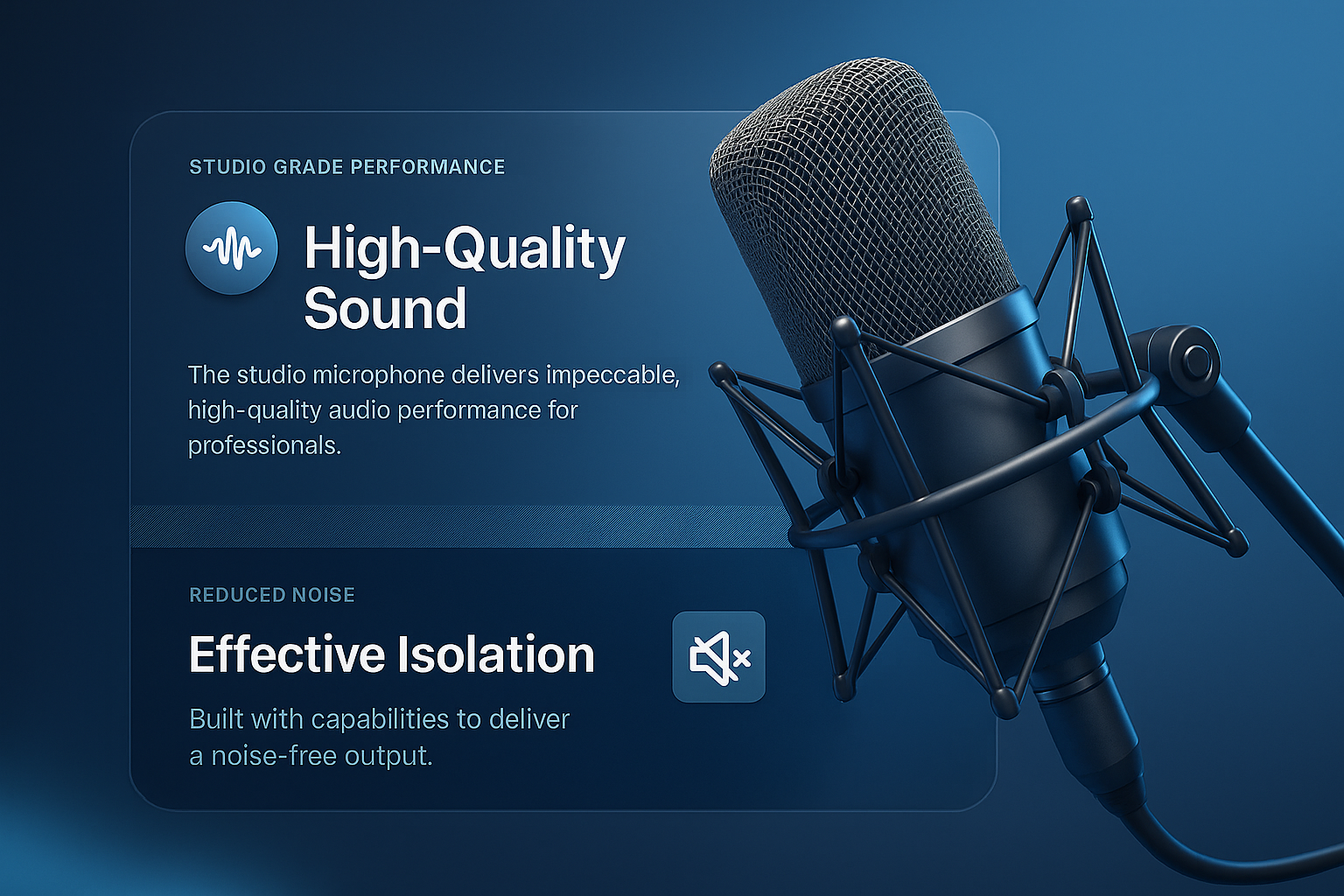 A sleek 3D illustration of a studio microphone, showcasing its features with integrated text blocks and graphics, set against a smooth gradient background.
