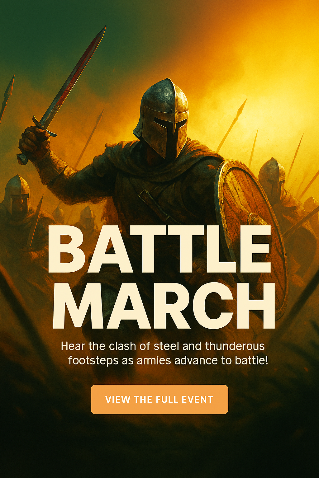 A dramatic battlefield scene depicting warriors in armor, set against a vibrant background. The text overlay emphasizes the event's intensity, inviting viewers to engage.