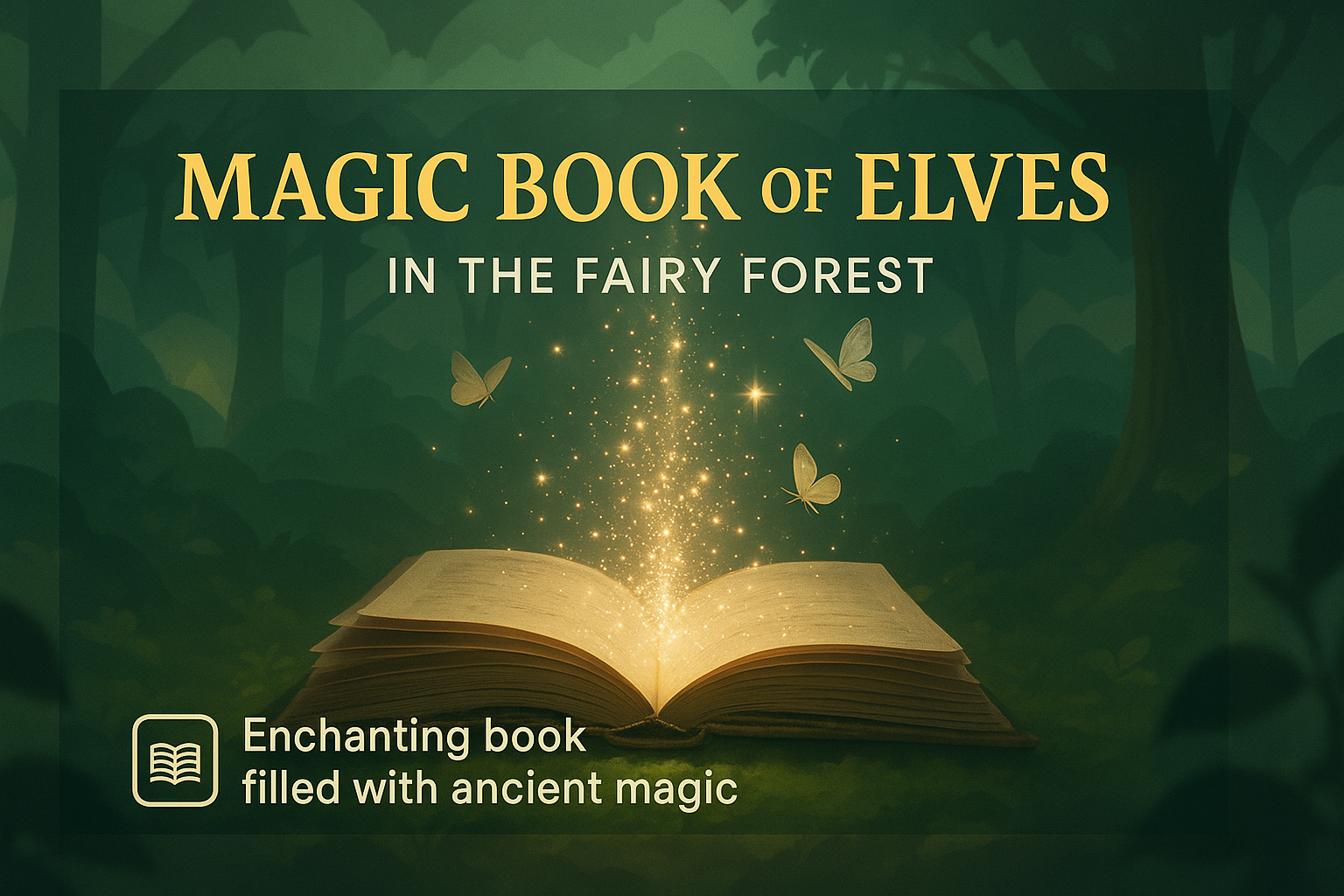/Collection: /by davooda/Type: PNG/Enchanting fantasy-themed illustration featuring an open book emitting sparkles and butterflies in a mystical forest, ideal for book covers or promotional materials.