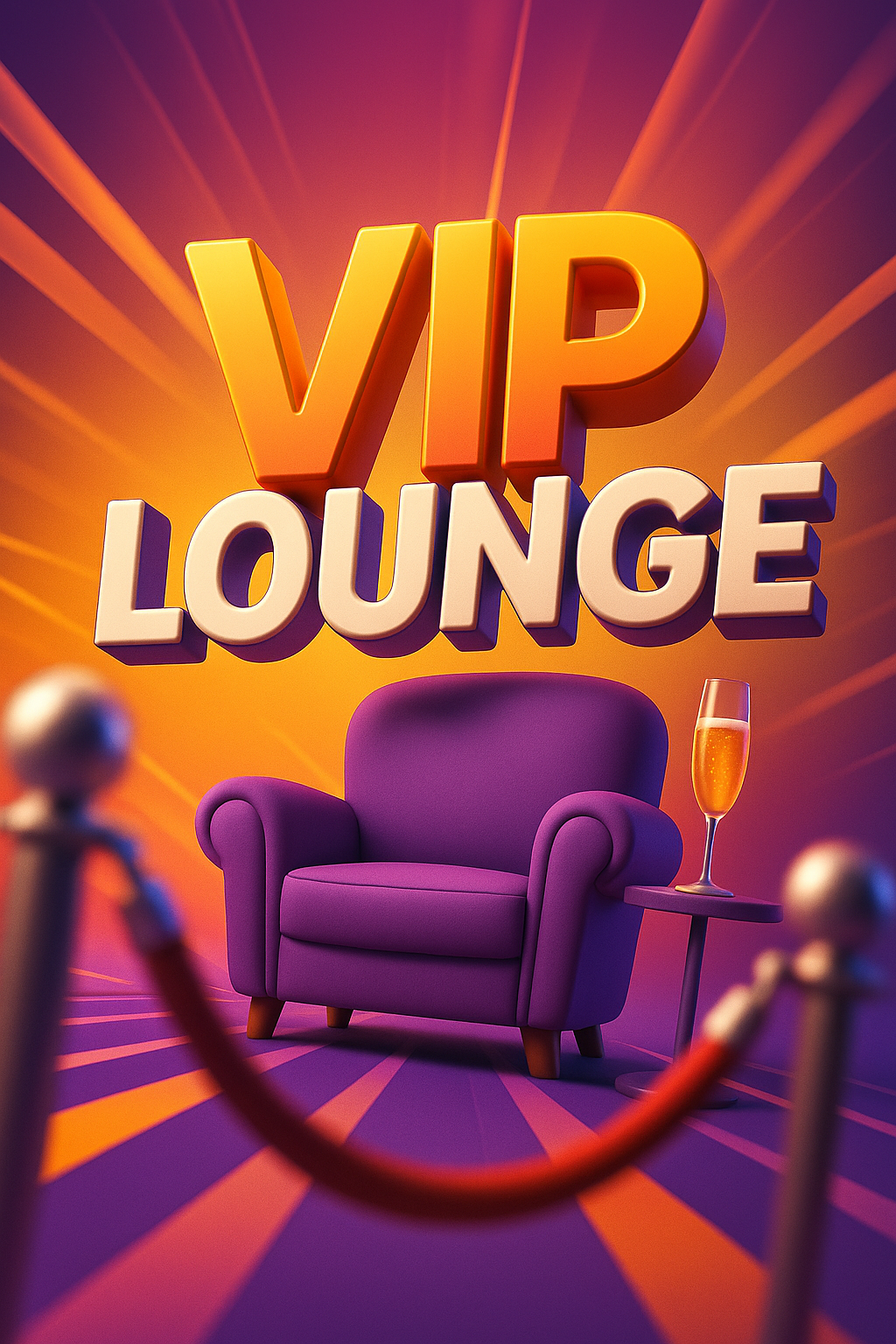 A vibrant 3D illustration showcasing a VIP lounge setting, featuring a stylized chair and a drink. The background boasts dynamic rays of color, creating an inviting atmosphere.