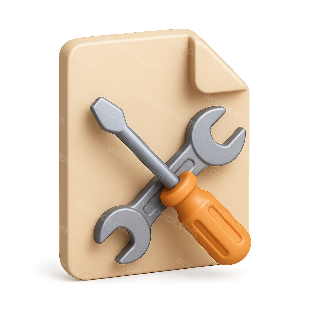 A three-dimensional icon depicting a file with a wrench and screwdriver overlay, designed in a volumetric style. It features a transparent background for versatile use.