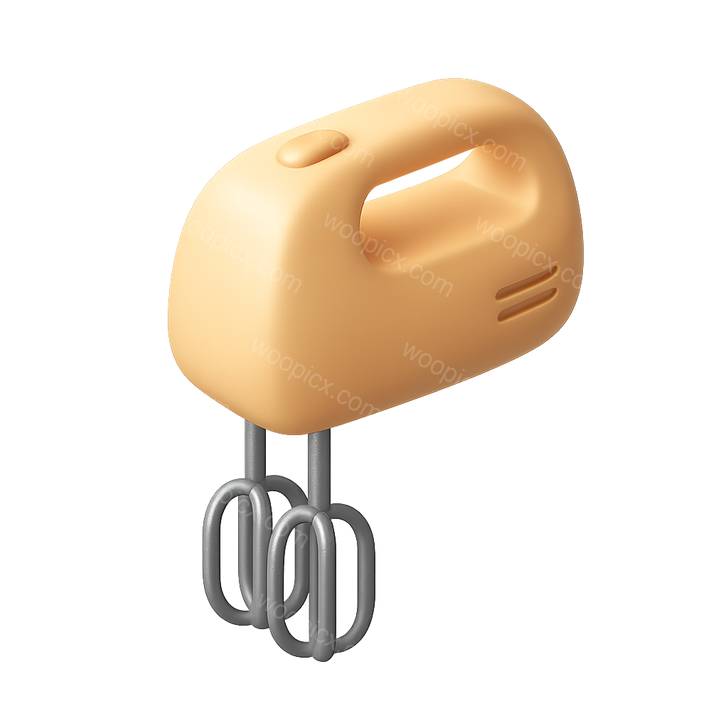 A 3D representation of a hand mixer featuring a vibrant orange body and metallic beaters, designed with a three-quarter view and a soft glow effect.