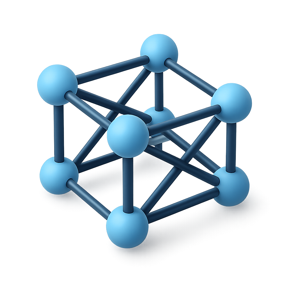 A visually striking 3D mesh network icon featuring interconnected spheres and rods, presented in a three-quarter isometric view with a transparent background.