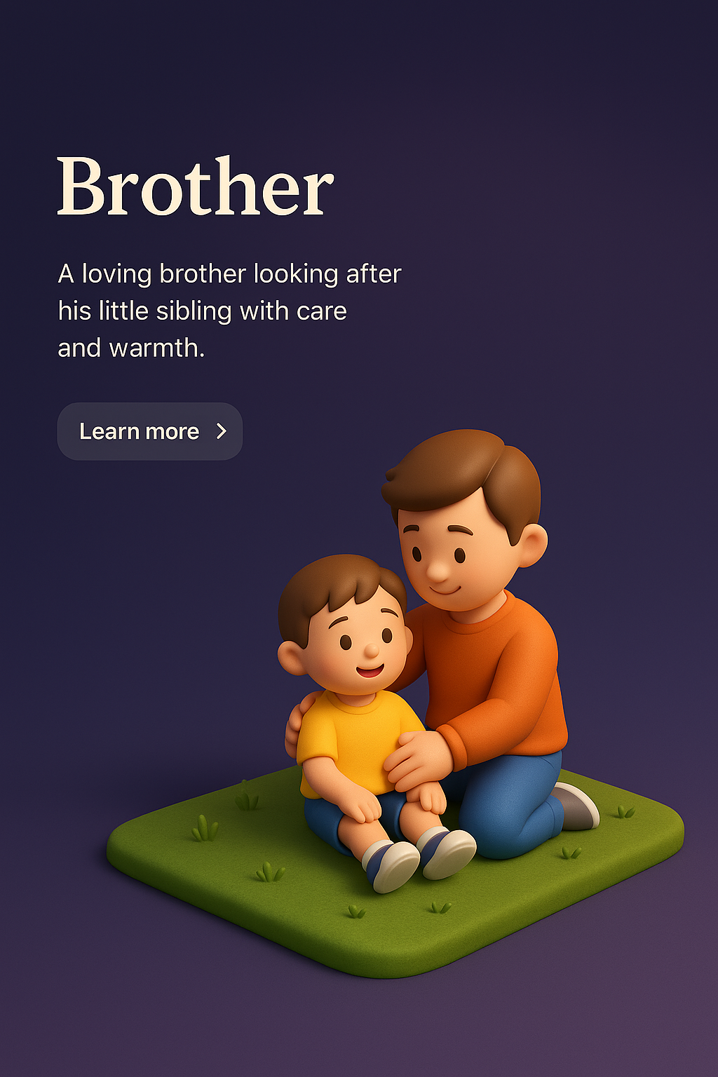 A cozy 3D illustration showcasing a brother lovingly embracing his younger sibling on a grassy patch, set against a dark gradient background.