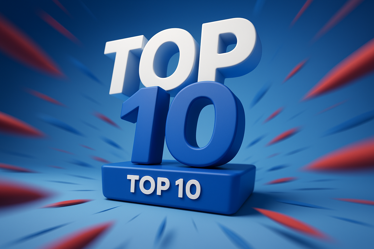 This vibrant 3D image features bold 'Top 10' text on a blue background, designed to grab attention, suitable for ranking lists or promotional content.