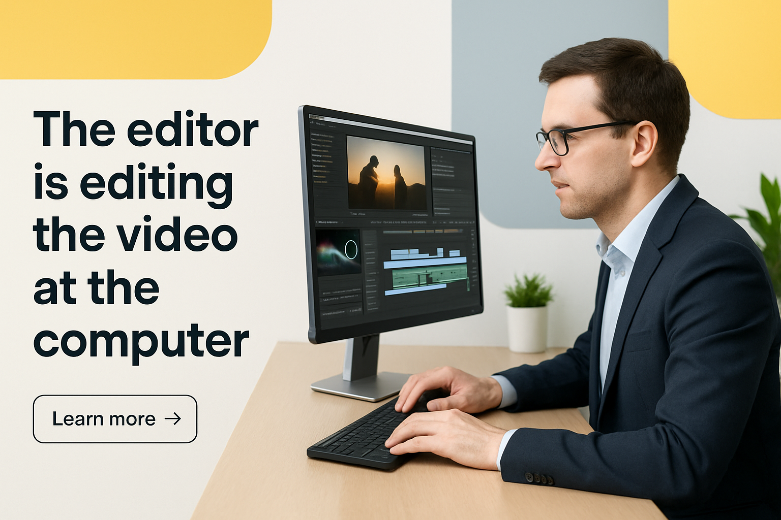 A professional video editor focused on his screen, with a clean corporate interface. The layout features bold typography and a well-composed background.