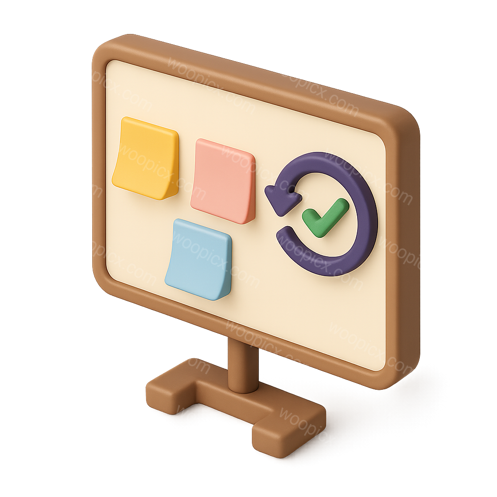 This image features a 3D icon depicting a board with colorful sticky notes and a circular arrow symbolizing retrospectives, designed in an isometric style.