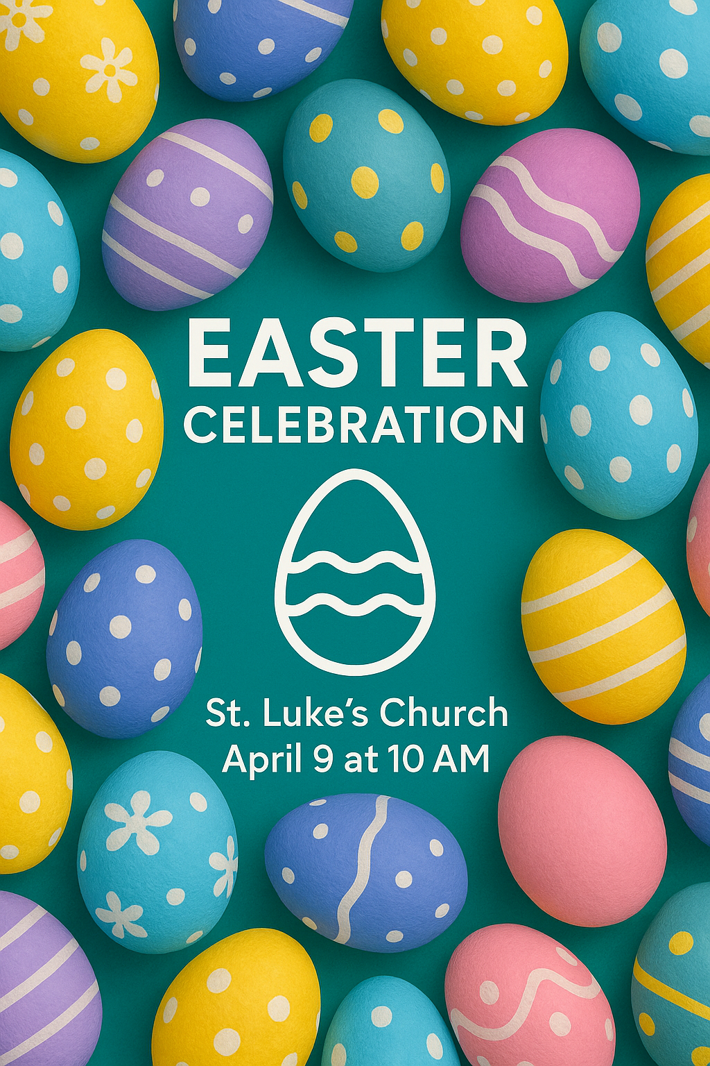 Vibrant promotional graphic for an Easter celebration featuring a variety of decorated eggs. Ideal for church events or community gatherings, with a festive and cheerful design.