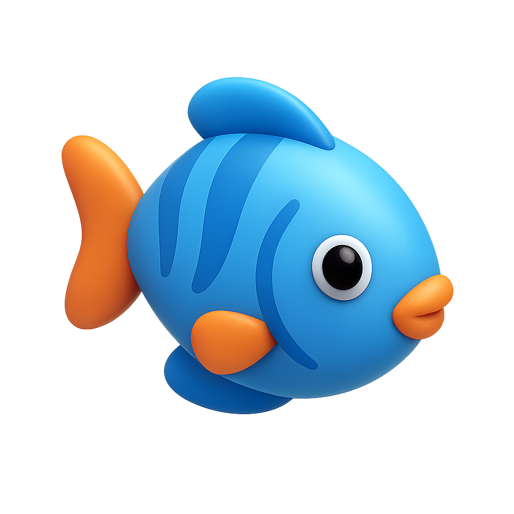 /Collection: /by davooda/Type: PNG/A vibrant 3D icon of a fish, featuring a blue body with orange fins and a cute expression, designed in a three-quarter isometric view against a soft gradient background.