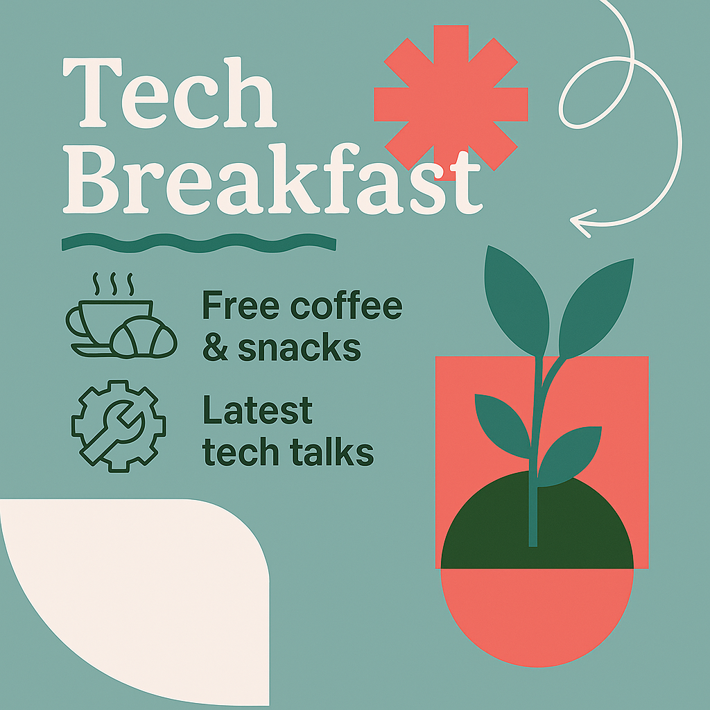 Promotional Graphic for Tech Breakfast Event Featuring Snacks and Talks