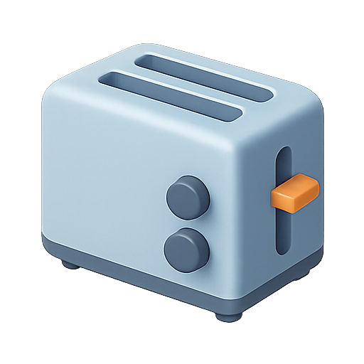 A sleek, modern 3D icon of a toaster featuring two slots and control knobs, ideal for kitchen-related graphics or digital interfaces.
