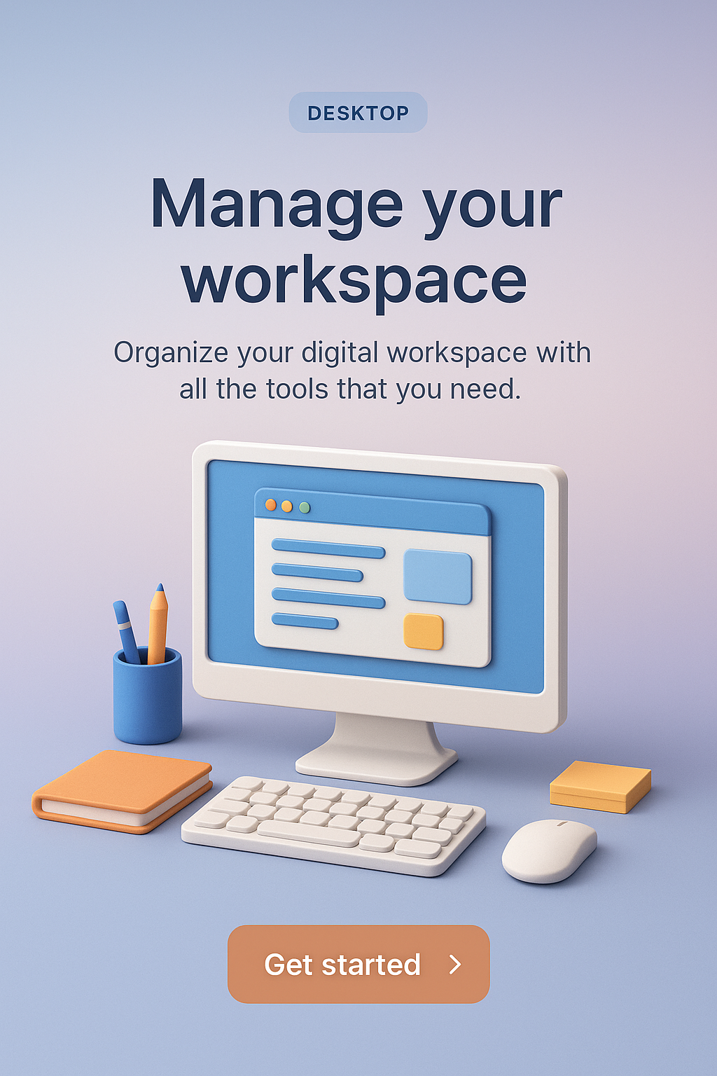 /Collection: /by davooda/Type: PNG/A detailed 3D illustration showcasing a digital workspace theme. It features a computer, stationery, and action button, all rendered in a zoomed-out perspective for clarity.