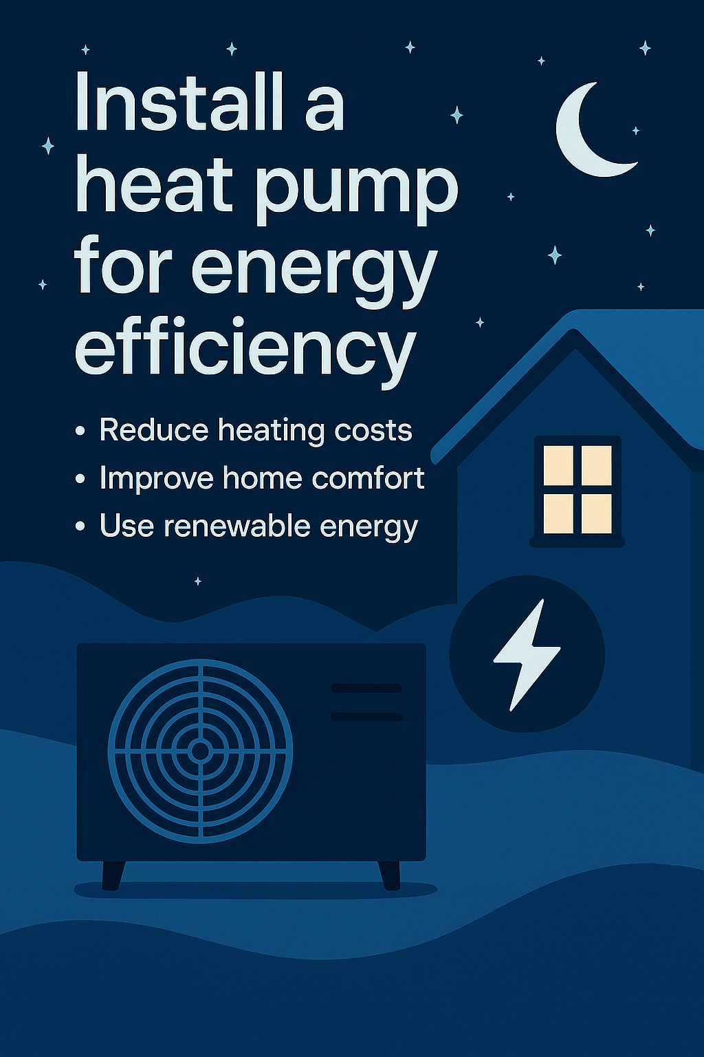 /Collection: /by davooda/Type: PNG/A visually engaging infographic promoting heat pump installation for energy efficiency, featuring a nighttime theme and appealing graphics suitable for environmental awareness campaigns.