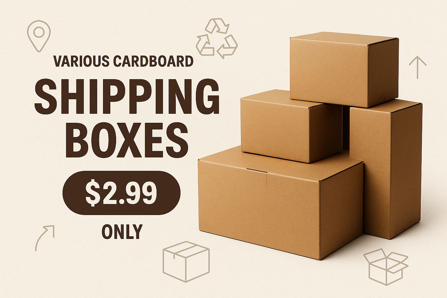 /Collection: /by davooda/Type: PNG/A striking mockup featuring various cardboard shipping boxes against a light textured background, highlighted by bold typography showcasing pricing and product details.