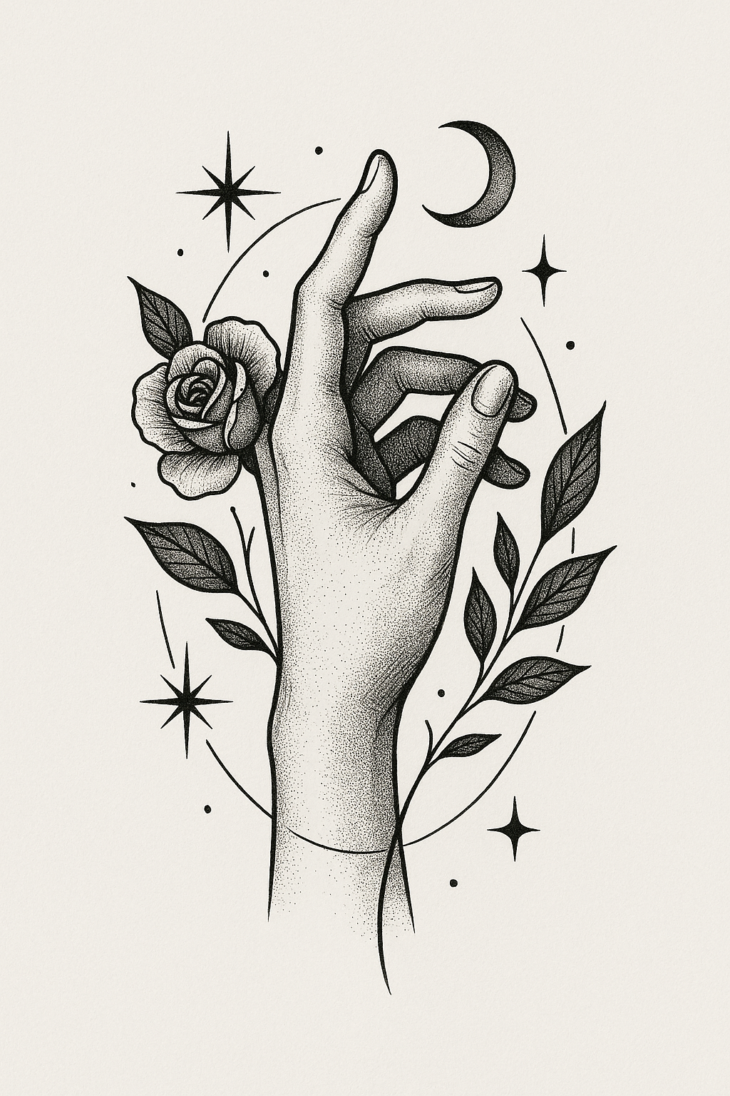 This image features a stylized hand reaching towards a crescent moon, surrounded by a rose and decorative leaves, ideal for art prints or tattoos.