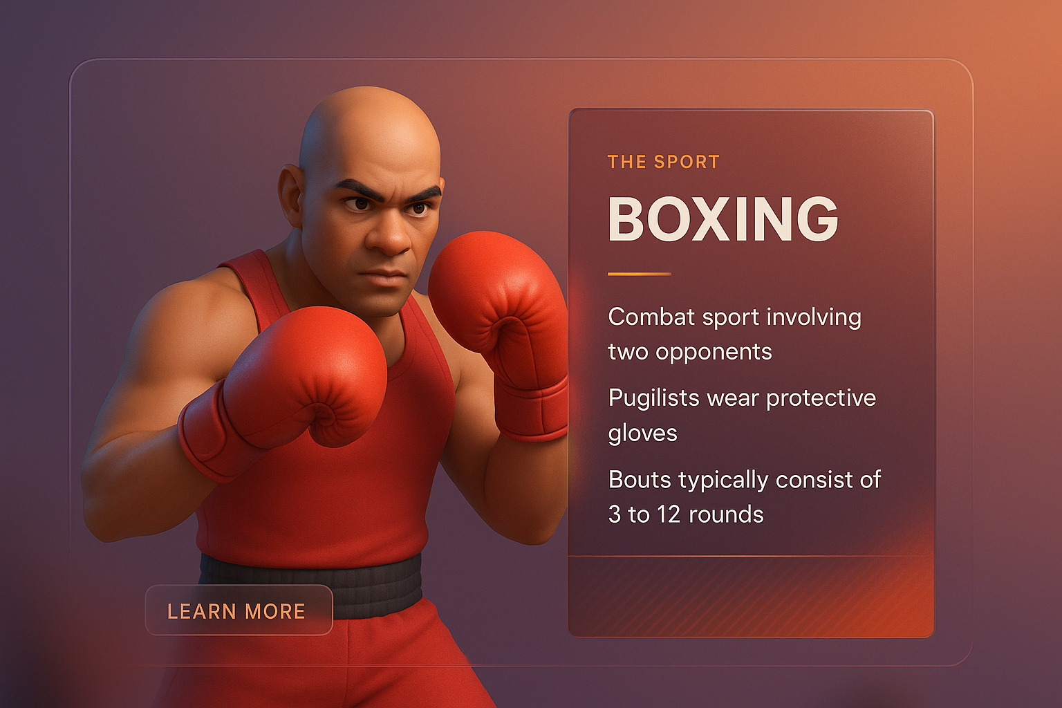 /Collection: /by davooda/Type: PNG/A vibrant 3D illustration of a boxer in red gloves, highlighted by an informative overlay that details the sport of boxing. The design features a smooth gradient background and cohesive text elements.