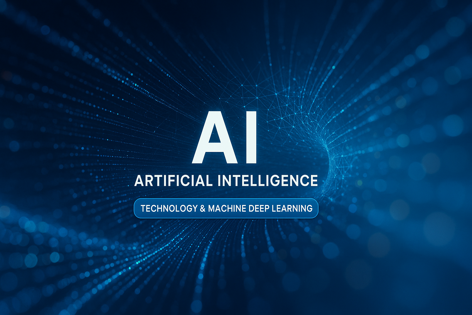 /Collection: /by davooda/Type: PNG/A visually striking graphic representing artificial intelligence and deep learning, featuring a dynamic background with glowing blue lines and dots, ideal for tech-related presentations or articles.