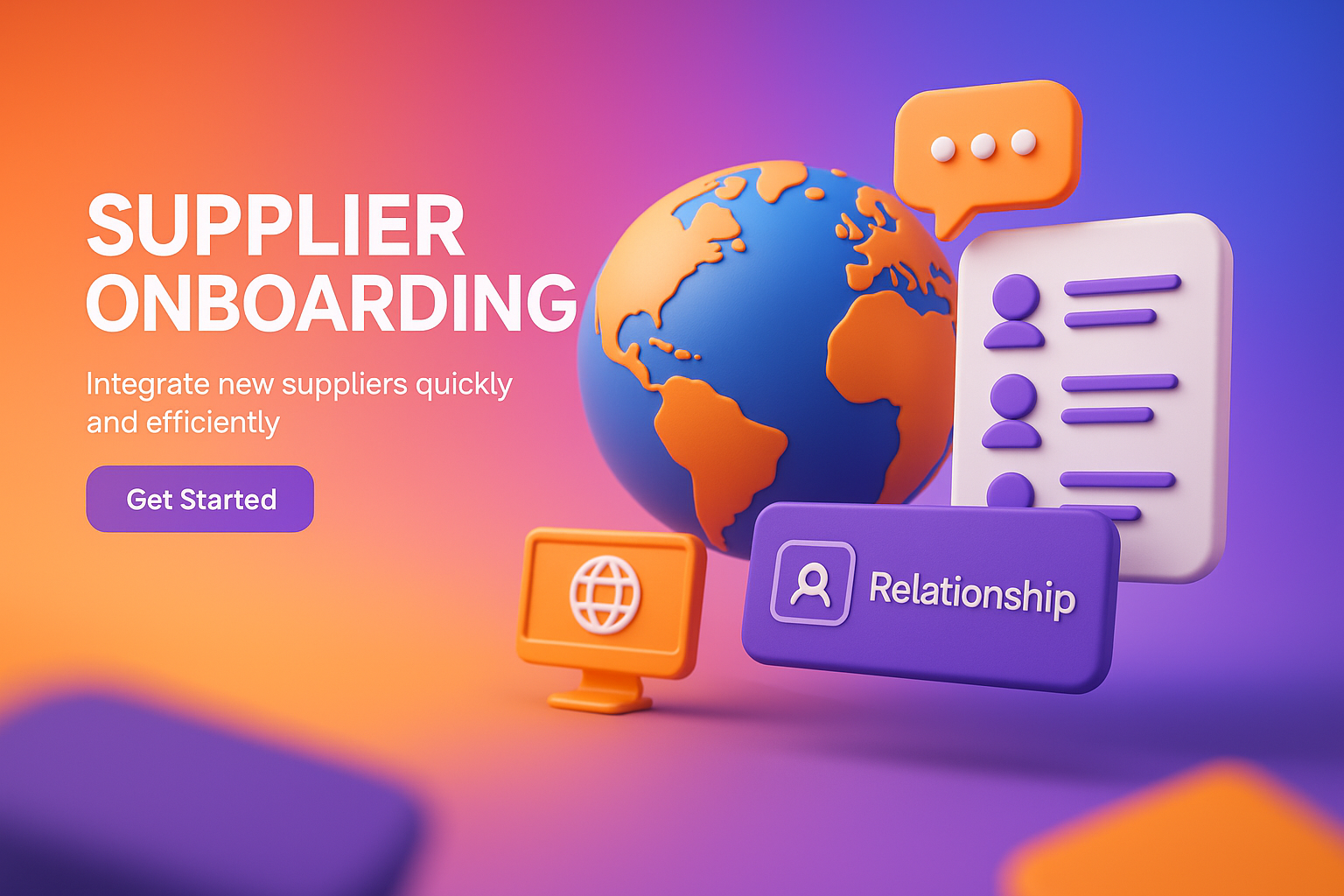 Vibrant 3D illustration depicting supplier onboarding with a globe, chat bubbles, and icons, ideal for digital marketing or onboarding platforms.