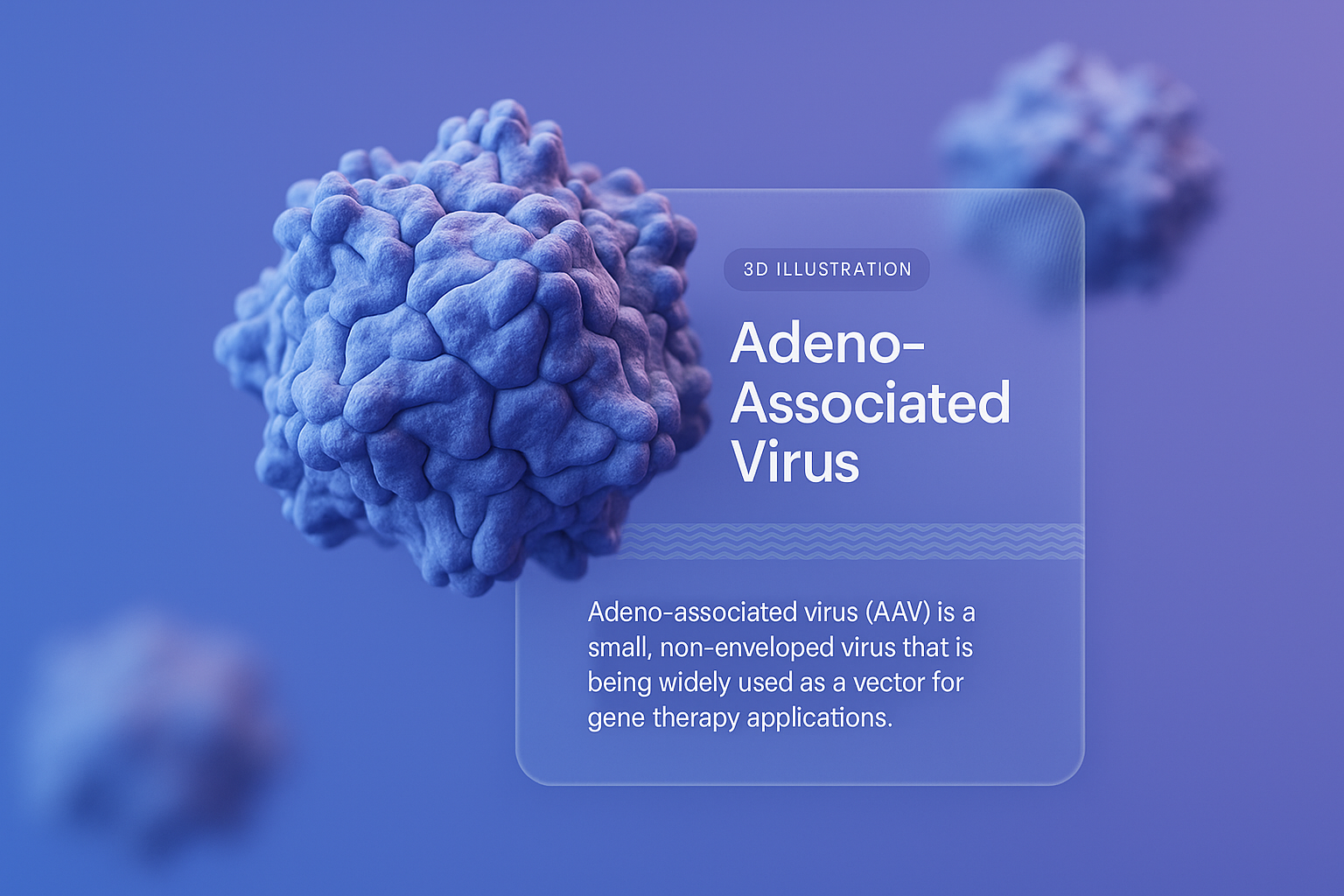 /Collection: /by davooda/Type: PNG/This image showcases a detailed 3D illustration of the Adeno-Associated Virus (AAV), highlighted against a smooth gradient background. It features an informative text block about AAV's role in gene therapy.