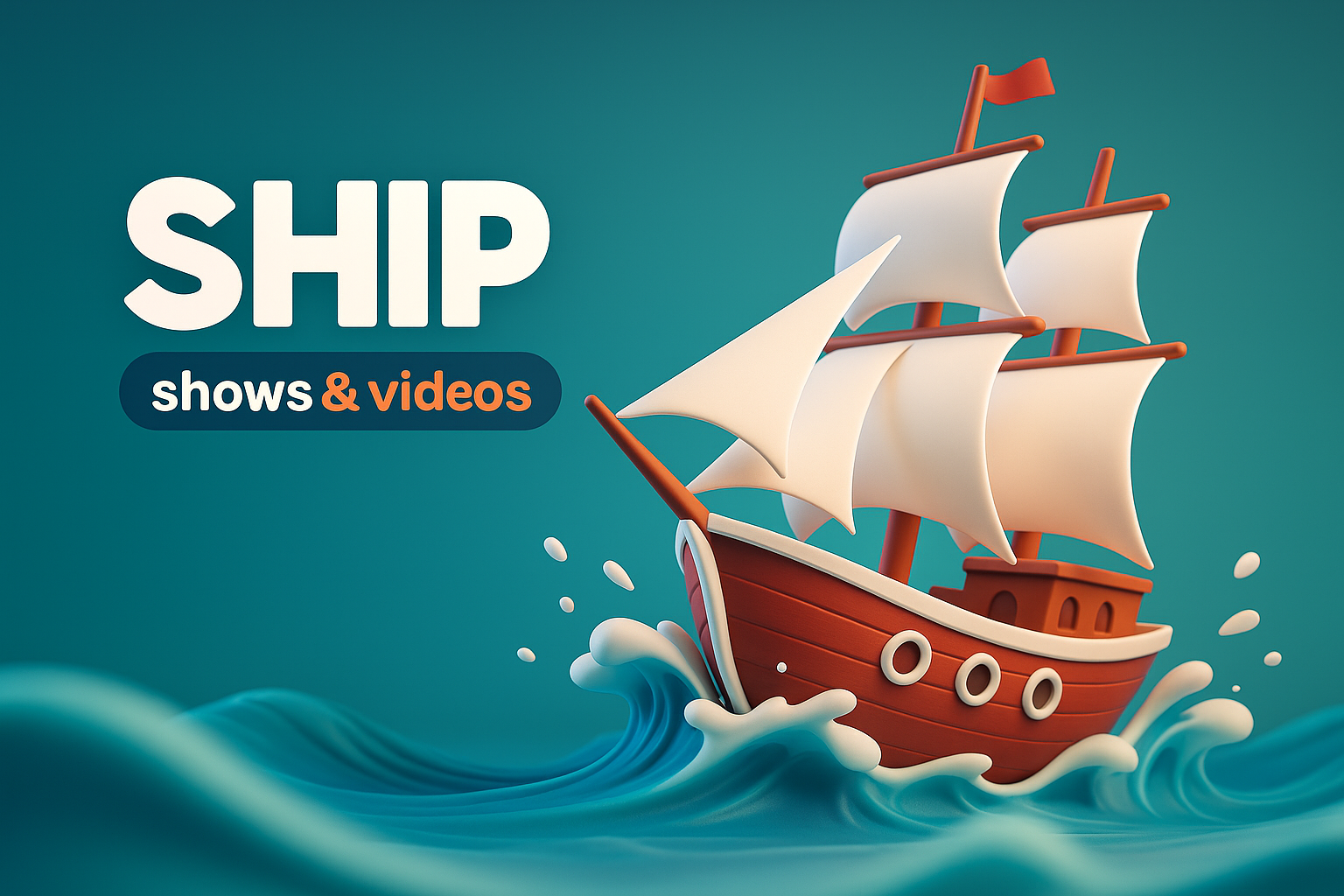 A vibrant 3D illustration of a ship navigating through dynamic waves. The design features a bold title emphasizing 'SHIP' with playful subtitle elements, all against a smooth gradient background.