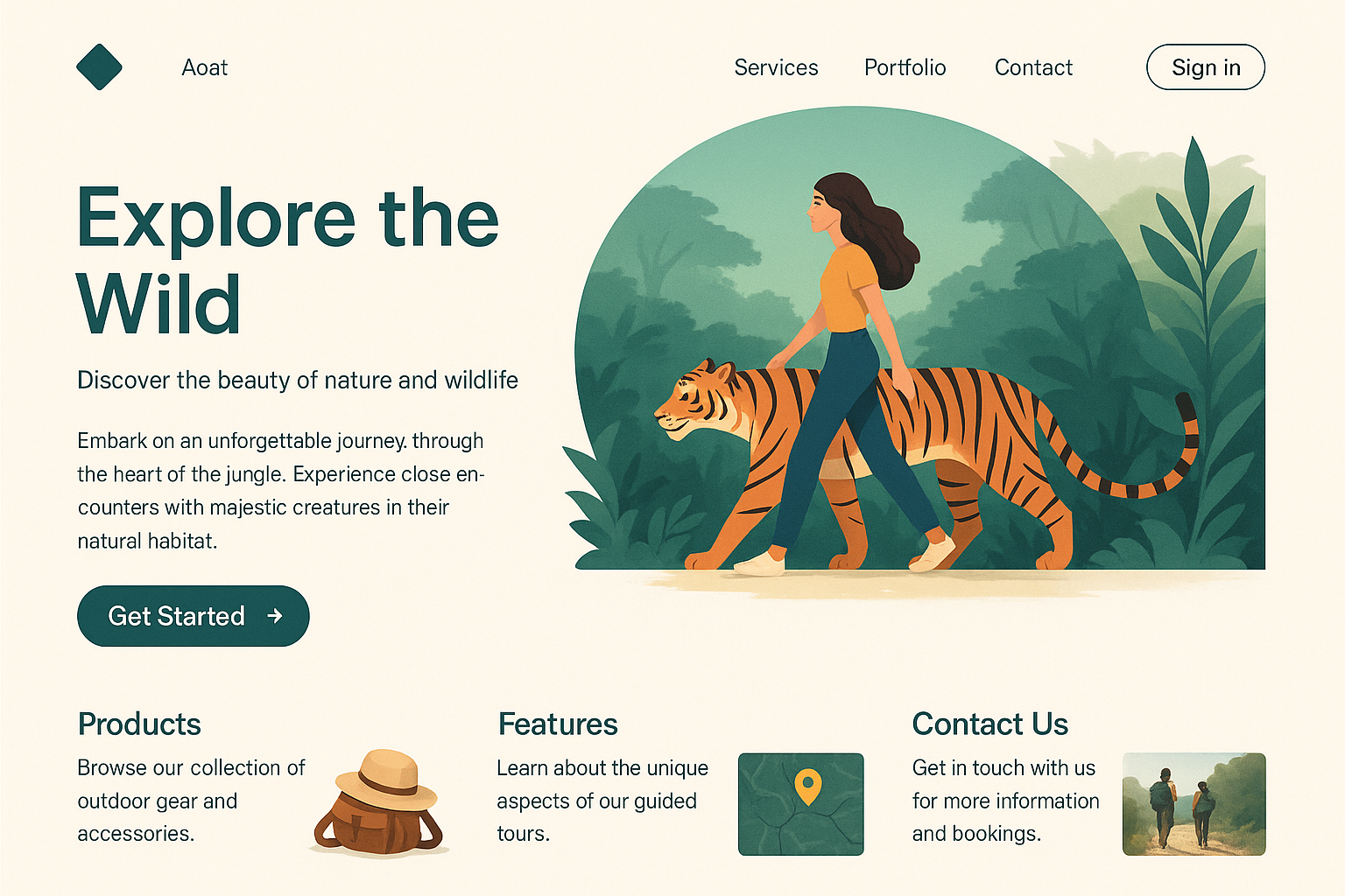 /Collection: /by davooda/Type: PNG/A vibrant landing page design featuring a girl walking with a tiger in a lush jungle. The layout includes engaging sections for products, features, and contact information, all with a harmonious color scheme.