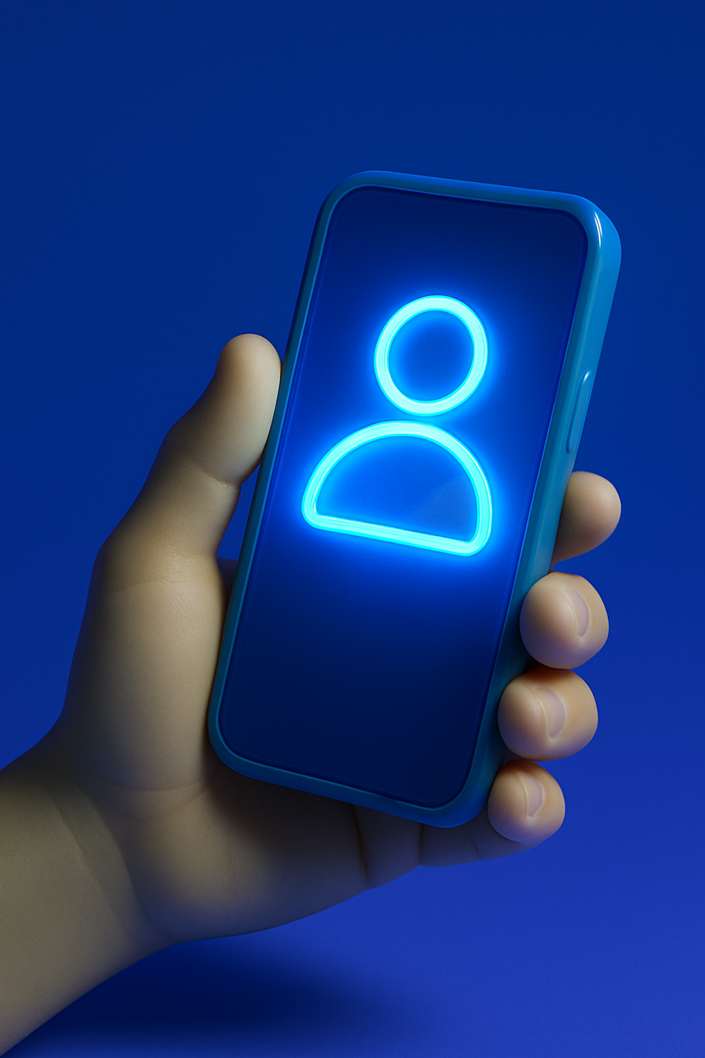 /Collection: /by davooda/Type: PNG/A realistic 3D representation of a phone held in a hand, featuring a glowing user icon on its screen. The background is a solid blue, enhancing the glowing effect.