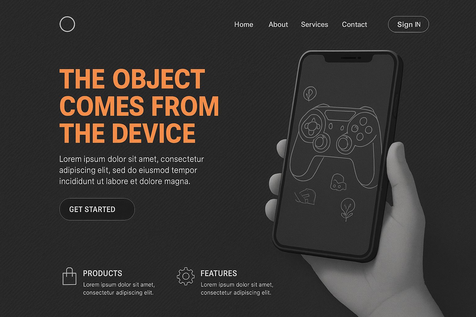 /Collection: /by davooda/Type: PNG/A sleek landing page featuring small typography, a smartphone illustration, and a bold headline. Elements include buttons, section blocks for products and features, and a well-structured layout.