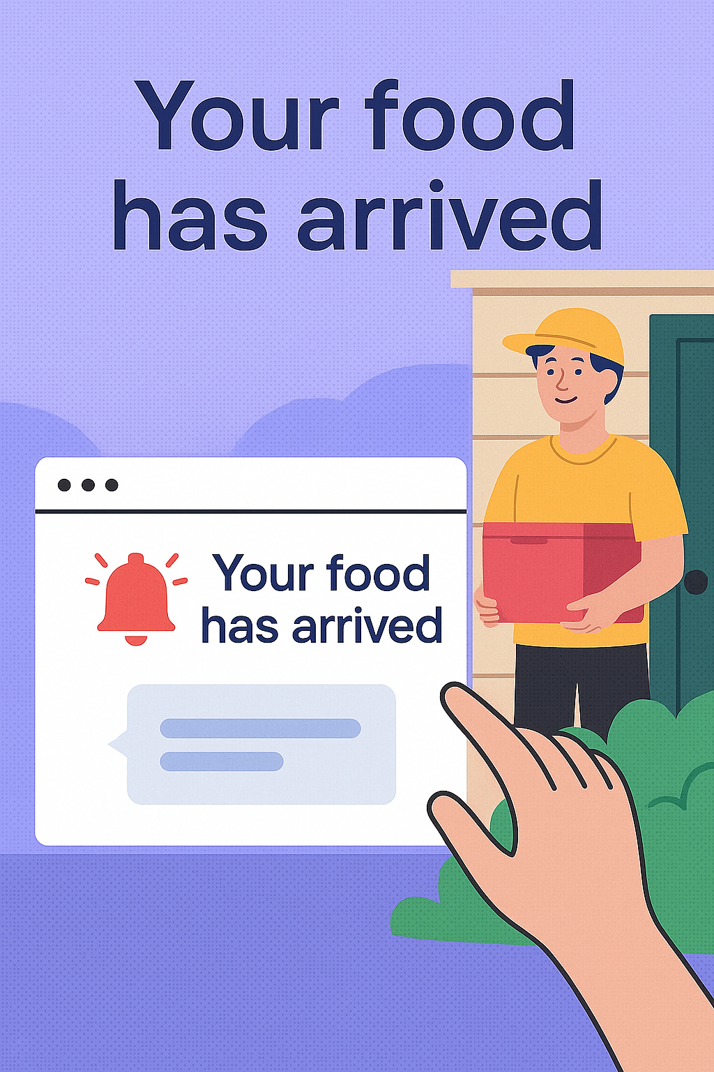 A vibrant illustration depicting a food delivery notification with a delivery person at a door. Ideal for food delivery apps and marketing materials.