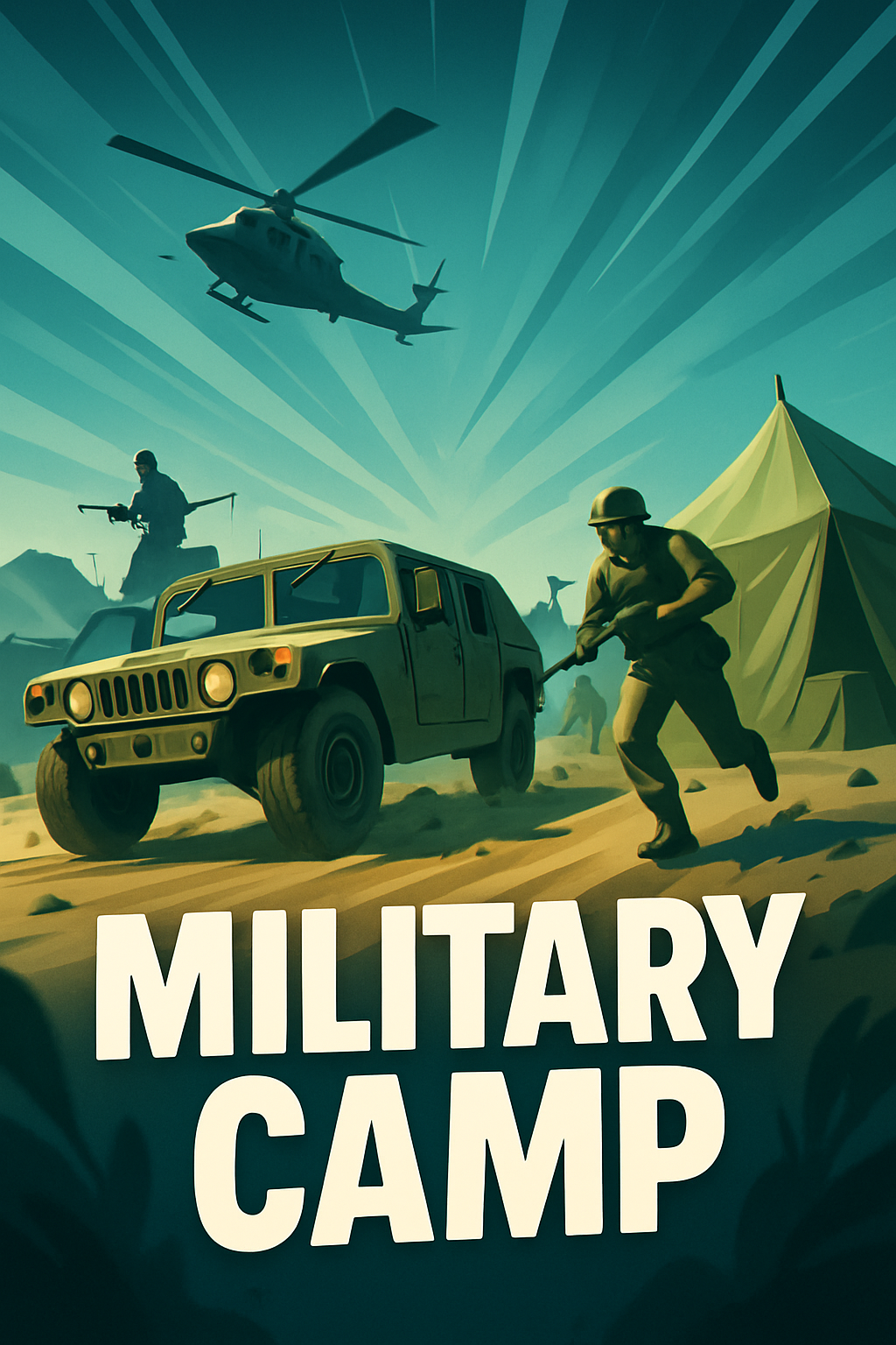 /Collection: /by davooda/Type: PNG/A vibrant depiction of a military camp showcasing soldiers, vehicles, and helicopters. The scene is filled with dynamic lines and a smooth gradient background, creating an engaging atmosphere.