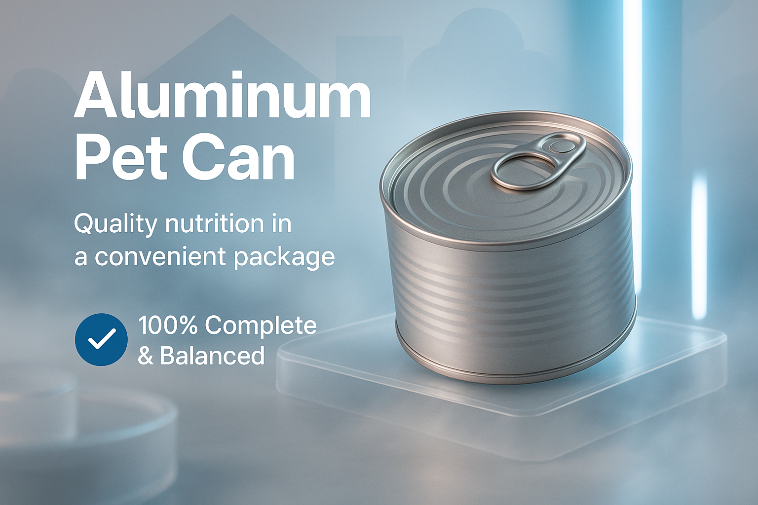 Stylized 3D rendering of an aluminum pet food can, showcasing its quality nutrition features. Ideal for branding and marketing purposes in pet product advertising.