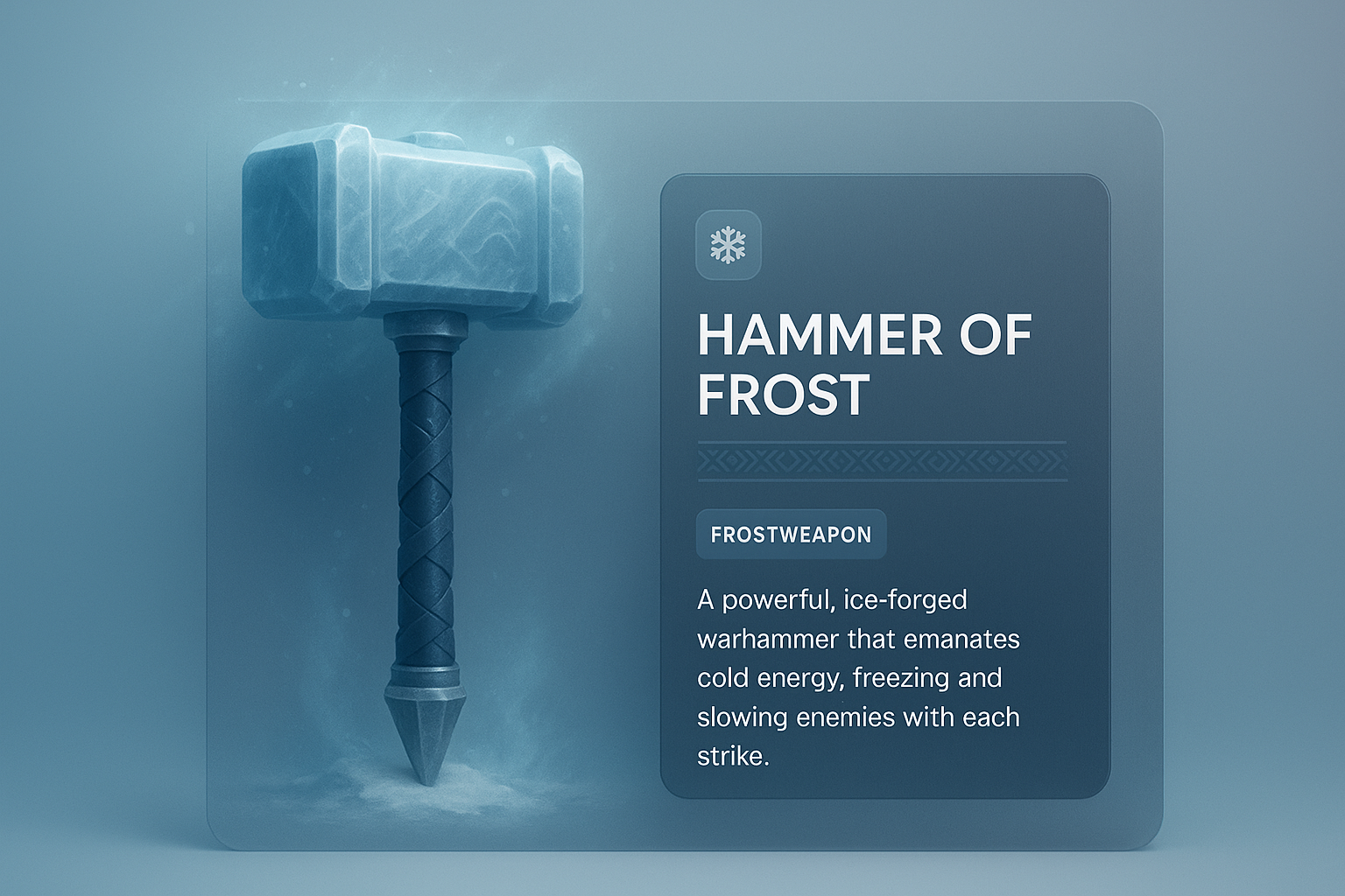 This image features a 3D illustration of the Hammer of Frost, a powerful warhammer that emanates cold energy. The design incorporates a soft gradient background and a sleek informational panel.