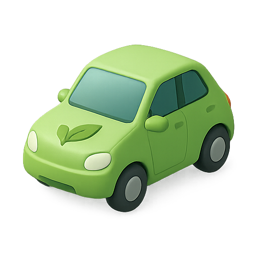 A vibrant, cartoonish illustration of a green eco-friendly car featuring a leaf motif, suitable for environmental themes or sustainable transport concepts.
