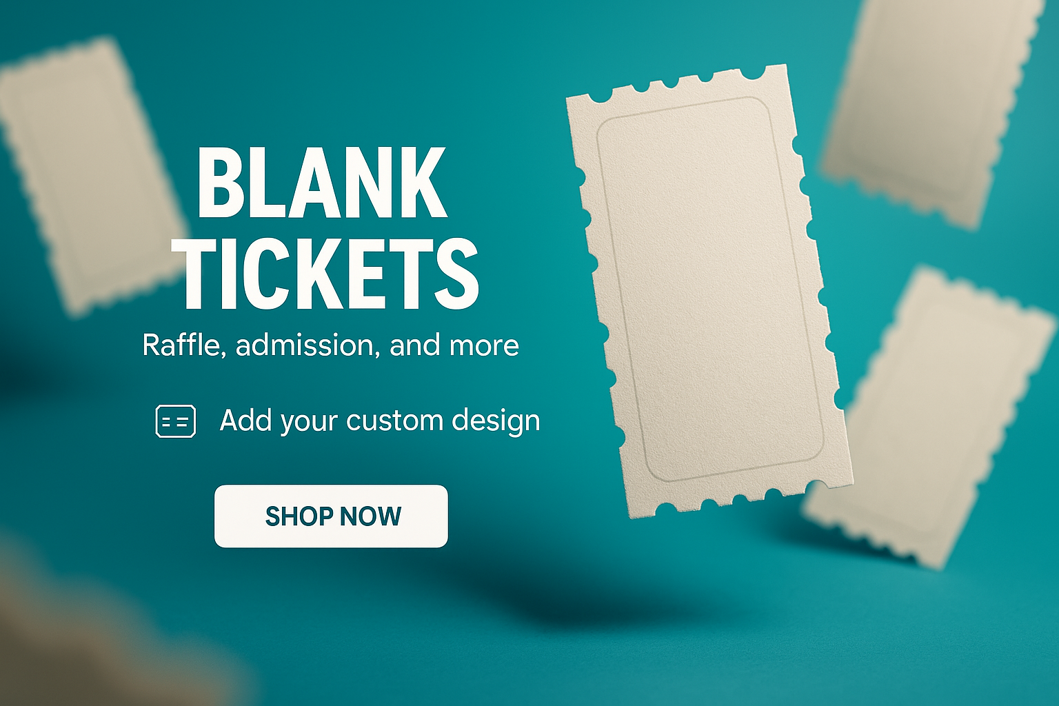 This is a promotional graphic for customizable blank tickets, featuring a modern design with floating ticket visuals. It's ideal for marketing and e-commerce use.