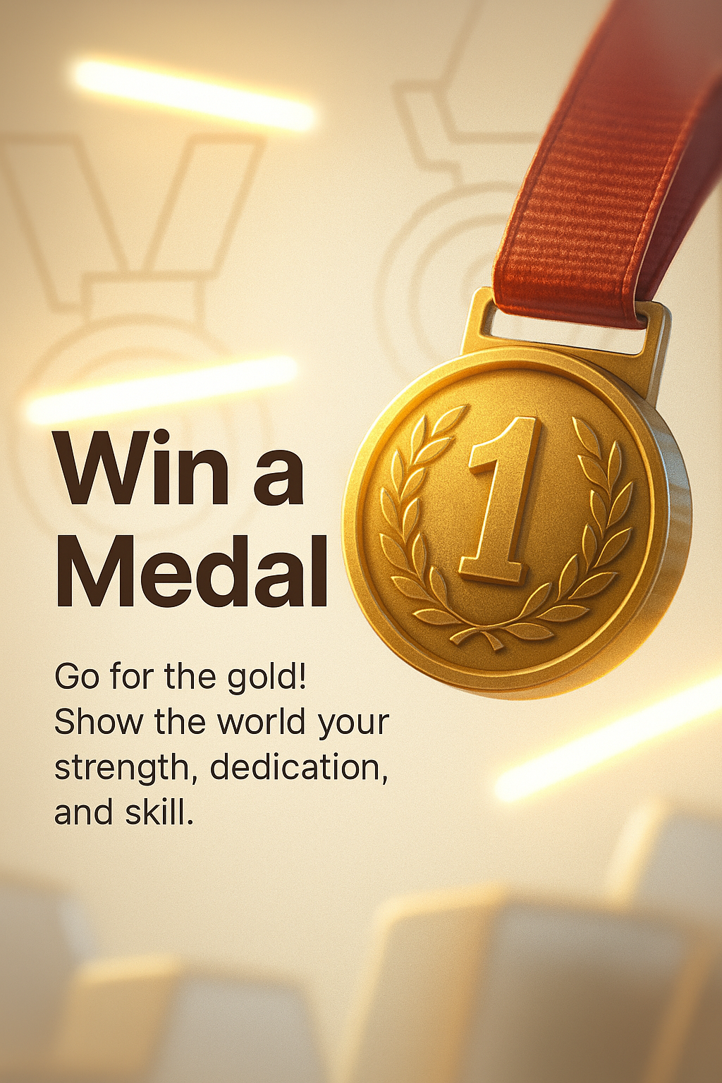 /Collection: /by davooda/Type: PNG/A visually engaging LinkedIn carousel slide featuring a gold medal with the text 'Win a Medal'. The design integrates neon elements and a bright, foggy background for a professional look.