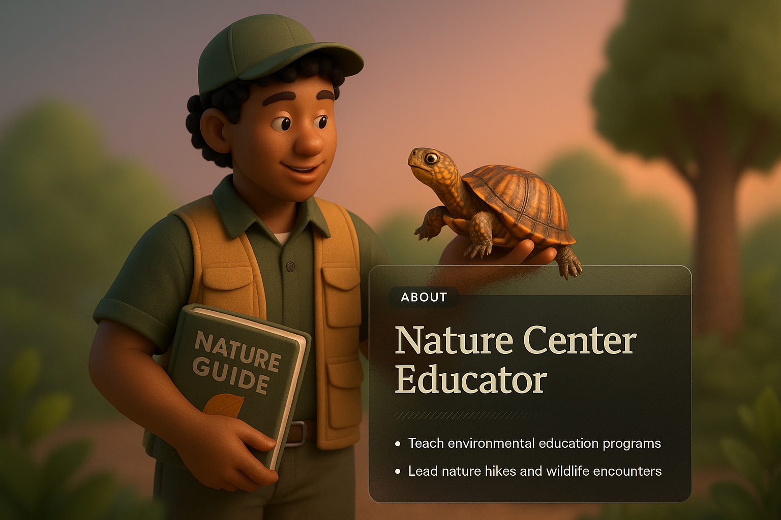 /Collection: /by davooda/Type: PNG/A 3D illustration featuring a Nature Center Educator holding a turtle, with a gradient background and an integrated information block. The design includes a title and additional graphics.